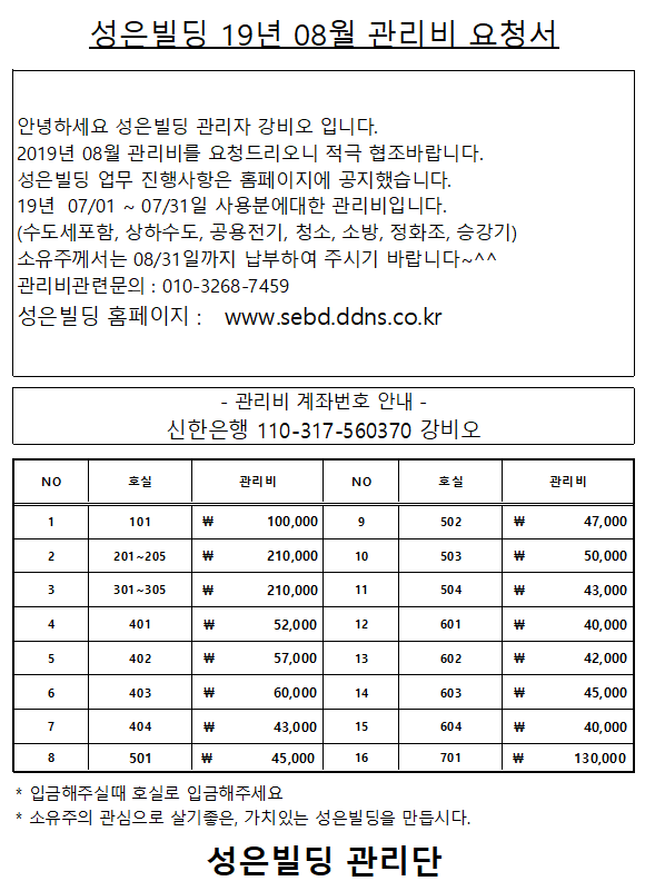 19년 8월 관리비 요청 문자송부했습니다. 페이지 정보 작성자 강비오 댓글 0건 조회 119,730회 작성일 19-08-26 10:15 목록 본문 적극적인 협주부탁드립니다. 댓글 0 댓글목록 등록된 댓글이 없습니다.
