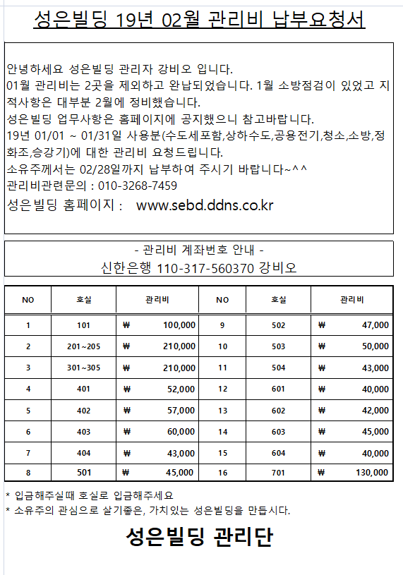 19년 02월 관리비 청구 문자보냈습니다. 페이지 정보 작성자 강비오 댓글 0건 조회 117,983회 작성일 19-02-22 10:30 목록 본문 잘 걷히길 기원합니다. 댓글 0 댓글목록 등록된 댓글이 없습니다.