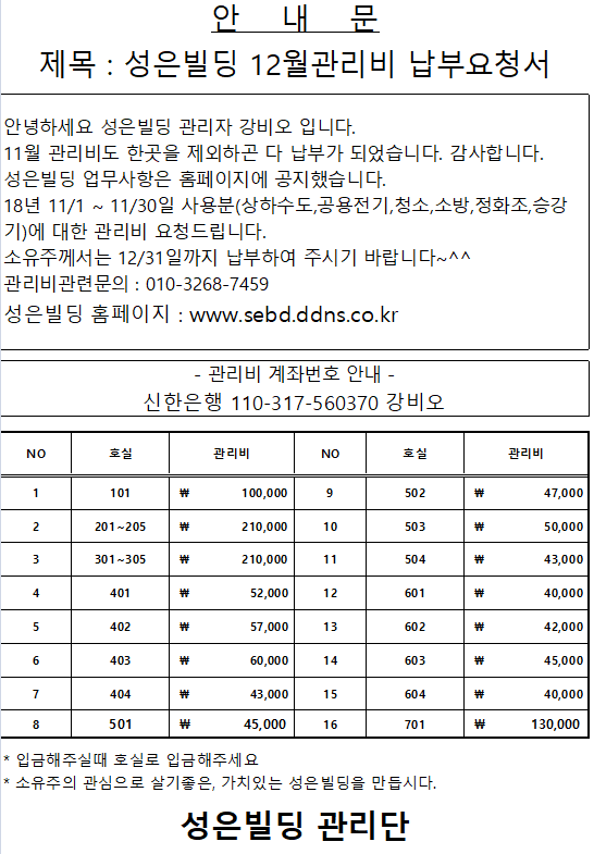 18년 12월 관리비 고지서 문자보냈습니다. 페이지 정보 작성자 강비오 댓글 0건 조회 111,881회 작성일 18-12-24 13:46 목록 본문 적극적인 협조부탁드립니다. 댓글 0 댓글목록 등록된 댓글이 없습니다.